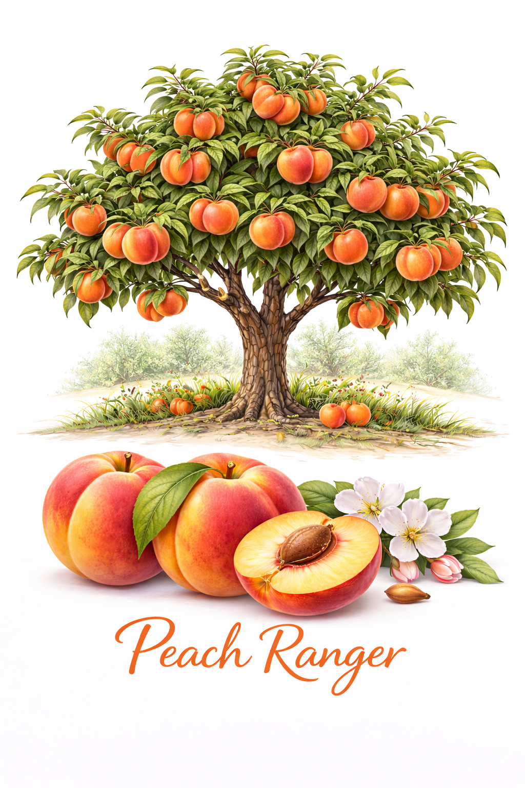 The Ranger peach is a cultivar of the standard peach species, known for being a cold-hardy, self-fertile, freestone tree that produces large, red-skinned, yellow-fleshed fruit.