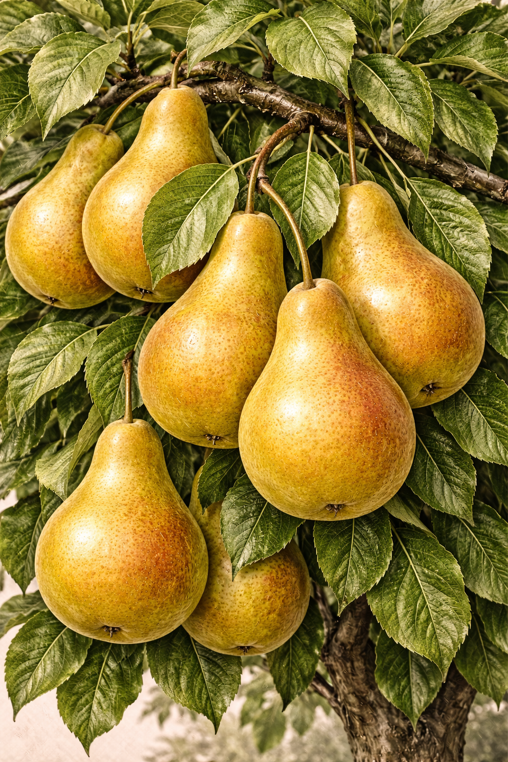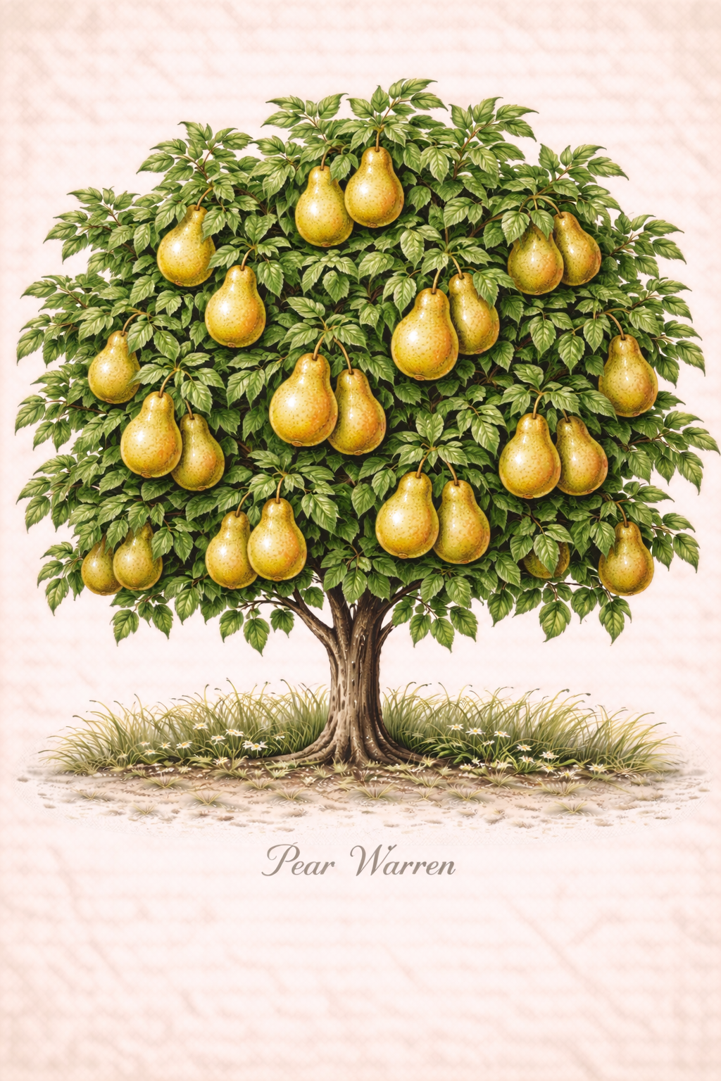 The Warren Pear is often called the "Postmaster's Pear" (discovered by T.O. Warren in Mississippi) and is legendary among fruit connoisseurs. It is frequently cited as the best-tasting pear in the world—even surpassing the famous 'Magness'. The Warren Pear is renowned for its exceptional flavor, often described as sweet, buttery, and juicy with a hint of vanilla. The fruit has a distinctive elongated shape with a golden-brown russeted skin. The flesh is creamy-white, fine-textured, and aromatic. Warren pears are typically harvested in late summer to early fall and are excellent for fresh eating, canning, and cooking.