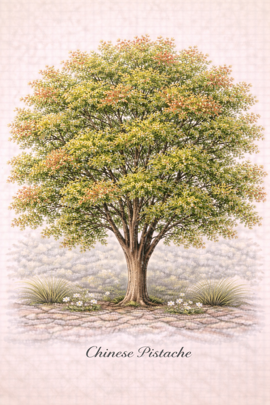 Maintenance: Because this tree can be a bit awkward in its first few years, it is highly recommended to have a professional structural pruning done when the tree is young. This ensures it develops a strong central leader and the balanced, rounded crown it is famous for. Once established, Chinese Pistache trees are relatively low-maintenance but benefit from regular pruning to remove dead, diseased, or damaged branches and to maintain a strong and attractive form. Pruning is best done in late winter or early spring before new growth begins. Chinese Pistache trees are relatively pest and disease resistant but may occasionally be affected by issues such as aphids, scale insects, or powdery mildew. These problems can usually be managed with proper cultural practices, such as providing good air circulation and avoiding overhead watering.