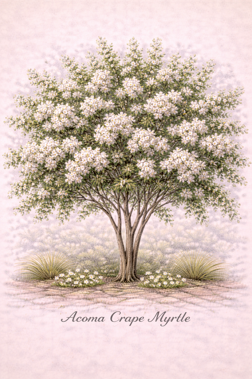 The Acoma Crape Myrtle is a standout semi-dwarf hybrid known for its graceful, weeping habit and pristine white flowers. It was specifically bred by the U.S. National Arboretum to be tough and disease-resistant. Unlike many other varieties, the 'Acoma' is highly resistant to Powdery Mildew, a common fungal issue for Crape Myrtles. Its unique "weeping" branch structure makes it a beautiful specimen plant for small yards, or even large containers. The plant features dark green foliage that emerges in spring and turns vibrant shades of orange, red, and yellow in the fall before dropping. In summer, 'Acoma' Crape Myrtles produce clusters of pure white flowers that cover the branches and last for several weeks, attracting pollinators like bees and butterflies.