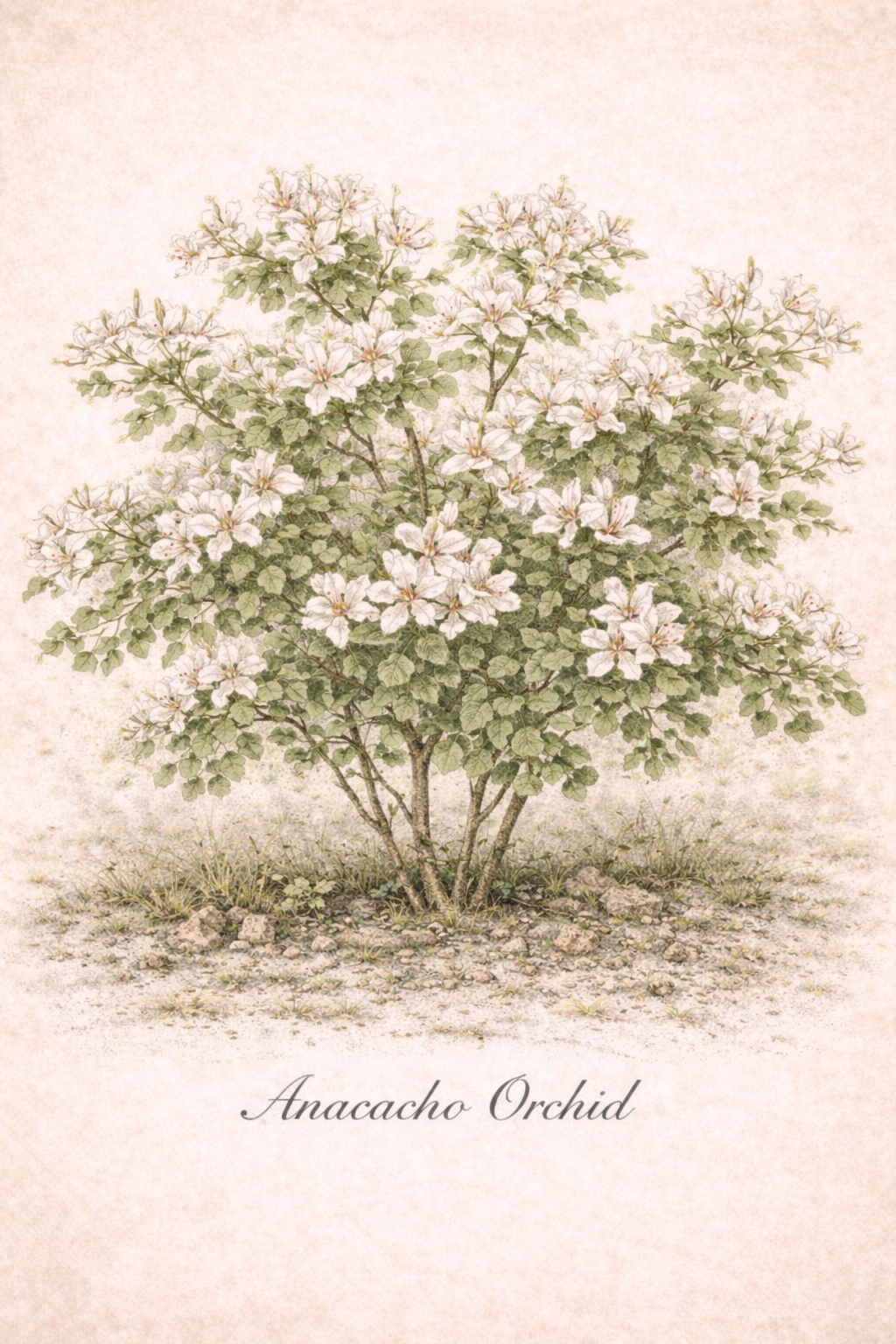 The Anacacho Orchid is named for its delicate, orchid-like flowers that bloom in spring, typically in April or May. These fragrant flowers are white with yellow throats and have a delicate, papery texture, resembling orchids hence the name. The tree produces compound leaves with two lobes, giving them a unique butterfly-like appearance. The foliage is typically bright green and provides an attractive backdrop to the flowers. After flowering, the tree may produce slender seed pods that contain small, bean-like seeds.The tree's compact size makes it well-suited for small gardens, urban landscapes, or as a focal point in mixed borders. The Anacacho Orchid Tree is a low-maintenance tree that requires minimal care once established. Pruning is generally not necessary for the Anacacho Orchid Tree, but it can be pruned as needed to remove any dead, damaged, or crossing branches. This tree is relatively pest and disease resistant but may occasionally be affected by issues such as aphids, scale insects, or powdery mildew. These problems can usually be managed with proper cultural practices, including good air circulation and well-drained soil.