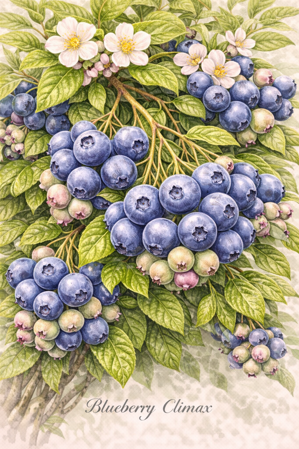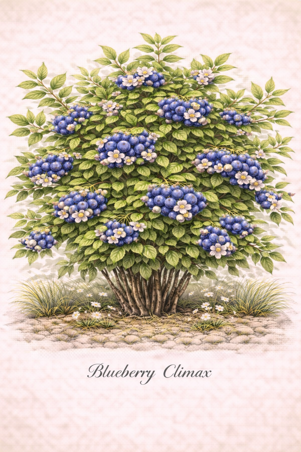 The Blueberry 'Climax', or Vaccinium ashei, one of the most reliable and widely planted "Rabbiteye" blueberries in the world. It is highly valued for its upright growth habit and its ability to produce a large, concentrated harvest early in the season. The Climax blueberry produces large, firm, and sweet berries that are dark blue to black when fully ripe. The berries have a rich flavor and are excellent for fresh eating, baking, or processing into jams and preserves. The plant itself is a deciduous shrub with attractive foliage that turns red in the fall, adding ornamental value to the landscape. In spring, it produces small, white, bell-shaped flowers that are attractive to bees and other pollinators. It is an early-season variety, typically ready for harvest in late May to early June in the Southern United States. Home gardeners and commercial growers choose 'Climax' because it "kicks off" the blueberry season. Its ability to produce a heavy, uniform crop early in the year allows growers to enjoy or sell fruit before many other varieties have even begun to turn blue.