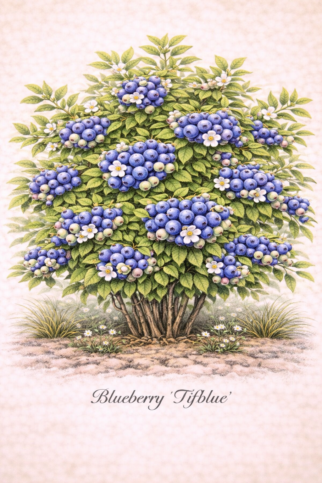 Water Requirements: Moderate to High. Like all blueberries, 'Tifblue' has a shallow root system. It needs consistent moisture (1–2 inches per week), particularly when the berries are sizing up in mid-summer. Regular watering is important, especially during the growing season, to keep the soil consistently moist but not waterlogged.